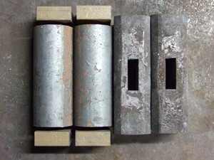 ![]() 鋼付四角玄能の地金・鋼・火造り品 第五章 玄能・金槌の素材 ・鋼付玄能・金槌の材質 鋼付玄能・金槌は、 鉄に鋼を張り付けて作ります。 そうすることで、 胴中(鉄)は軟らかく打撃面(鋼)を硬く作ることが出来、 使用の際には、 その軟らかな胴中が打撃時の衝撃を吸収することで、 使い心地が良くなり、 使用者の手首や肘等への負担を軽減する効果が得られると言われます。 胴中の鉄には、 炭素量の少ない軟らかなものが使われます。 打撃面の鋼には、 炭素量の比較的多いものが使われます。 因みに、 鋼の生産量及び流通量が少なく高価だった時代には、 少量の鋼と安価な鉄地金で出来てしまう鋼付が主流でした。 その後、 昭和30年代以降に鋼の生産量が急拡大し、 鋼が安価になり始めます。 また時を同じくして、 600℃程度まで加熱されても軟らかく成り難い「熱間金型用鋼」が普及し始め、 その熱処理技術も進歩します。 すると、 耐熱性の低い目打ち金を使い軟らかな地金にヒツ穴を明ける事が精一杯だったものが、 熱間金型用鋼を用いた耐熱性に優れた目打ち金の製作使用が可能となり、 硬い鋼にヒツ穴を容易に明けることが可能と成ります。 それにより、 鋼を付ける手間の掛からない、 作業工程上有利な丸鋼玄能・金槌が主流と成っていく訳です。 ただし、 丸鋼は鋼付よりも焼入れが遥かに難しいので、 理想的な焼入れをする為に、 鍛冶屋は大変な苦労をしたようです。 ![]() 地金に使用する日本鉄 ![]() 地金に使用する錬鉄 |