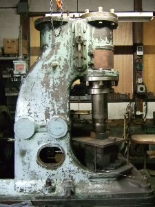 ![]() ・四角玄能120匁を造る (2) 次にヒツ穴を抜きます。 八角形に成形した素材を炉の中に入れ再加熱します。 程よい温度になったところで取出し、 目打ち金というタガネ様の道具を八角形に成形した素材の中心にあてがい、 機械ハンマーで叩きます。 ヒツ穴抜きには5本の目打ち金を使いますが、 最初に1番目打ち(1番細くて、テーパーも1番きつい)を 材料の5分の3程度の深さまで叩き込みます。 いったん目打ち金を抜いてから材料を裏返し、 先ほどの正反対から1番目打ちを材料の5分の3程度の深さまで叩き込みます。 するとひまわりの種くらいの小さな金属片(目くそ)がぽろりと抜けて、 ヒツ穴が貫通します。 加工中に出る廃材はこの目くそのみとなります。 実はこの1番目打ちを如何に正確に打ち込めるかで、 ヒツ穴抜きの勝負はほぼ付いてしまうので、 玄能造り全般においても最も神経を使うところで、 腕の見せ所ともなります。 その後また炉の中に入れ加熱します。 次に、 1番目打ちより少し太めでテーパーも弱い2番目打ちを使い、 抜いた穴を押し広げていきます。 その後も加熱を繰り返し、 3番目打ち、 4番目打ち、 そして5番目打ちを使い、 ヒツ穴を押し広げるとともに、 全体を目的の寸法と形状に整えていきます。 なお、 5番目打ちは機械ハンマーを使わずに、 小槌を使い人力で叩き込みます。 その後800℃程度まで加熱して、 焼もどしておきます。 以上の作業で注意することは、 工程ごとに再加熱温度を少しずつ下げて作業を進めることです。 そうすることで玄能全体の酸化膜の発生を防ぎ、 唯一火造り後にヤスリ掛けをしないヒツ穴内を清浄に保つことが出来ます。 またそうすることで、 必然的に鋼の組織が整い、 最終的に強い玄能となりますが、 組織を整えるなどと言うと、 科学的に研究された事と捉える人も居ますが、 必要な鍛冶作業を手を抜かずにやれば、 自然とそうなります。 |