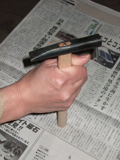 ・上記の方法でもしっかりと固定されない場合には、頭部を下にして柄を叩きこんでください。この場合、頭部の穴より柄の先端が出てしまうことがありますので、その心配があるときには画像のように当て板を利用して、先端部が地面に当たらないようにするといいでしょう。その後上記同様に必要に応じてクサビを深く打ち込みなおしてください。 |