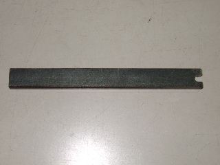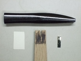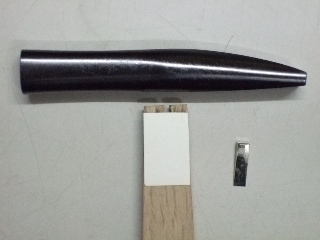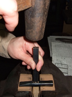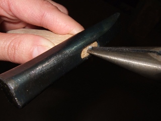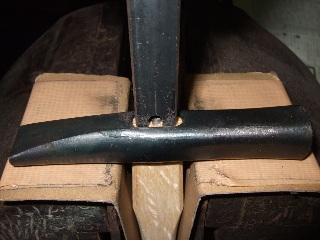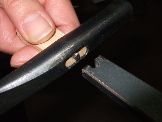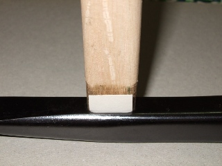 ・まずは柄を抜く道具を製作します。画像のものは、鉄のフラットバー(薄板)を加工したものです。端部を頭部の穴に叩きこんで柄を抜く仕掛けですが、左端はクサビを取り除いた場合に使用しますが、溝を切ってある右端はクサビが取り付けてあるままの状態で木柄を抜く場合に使用します。こうしておかないとこの道具の先端でクサビをさらに深く押し込むことになり柄が抜けてくれないからです。 |