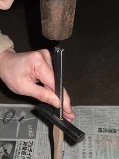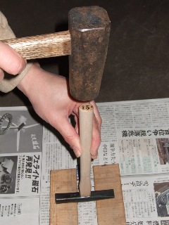 ・柄を抜いているところです。今回はバイス(万力)の口金部分に頭部を掛けて行いました。頭部に傷をつけないよう、新聞紙などを敷いて行うと良いでしょう。クサビのついた状態で柄を抜いた場合には、クサビは一旦取り外しておきます。 |