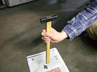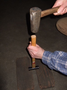 ・上記の方法でもしっかりと固定されない場合には、頭部を下にして柄を叩きこんでください。この場合、頭部の穴より柄の先端が出てしまうことがありますので、その心配があるときには画像のように当て板を利用して、先端部が地面に当たらないようにするといいでしょう。その後上記同様に必要に応じてクサビを深く打ち込みなおしてください。 |