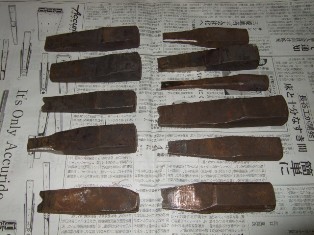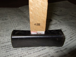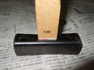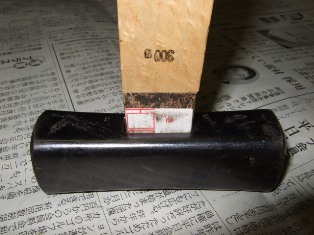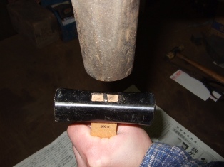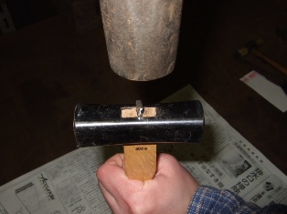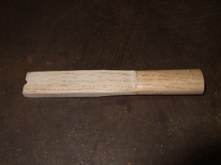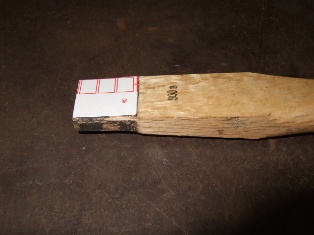 ・まずは柄を抜く道具を製作します。画像のものは、いらなくなった木柄を削って作ったものです。左側の端を頭部の穴に叩きこんで柄を抜く仕掛けです。クサビが当たる部分は削って逃しておきます。こうしておかないと、この道具の先端でクサビをさらに深く押し込むことになり、柄が抜けてくれません。 |