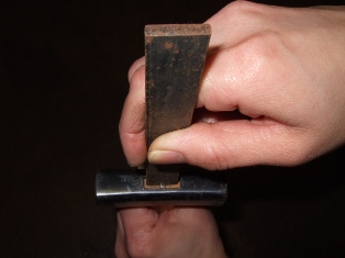 ・クサビを打ち込みなおすとき、玄能穴の奥にクサビがある場合には、画像のような金属製の板を使用すると良いでしょう。 |