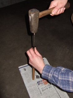 ・金属製の板を使用してくさびを打ち込んでいるところです。 |