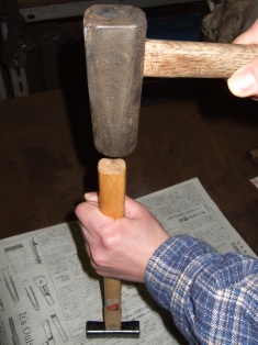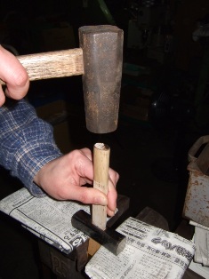・柄を抜いているところです。今回はバイス(万力)の口金部分に頭部を掛けて行いました。頭部に傷をつけないよう、新聞紙などを敷いて行うと良いでしょう。柄を抜いたら、先端についていたクサビは一旦取り外しておきます。 |